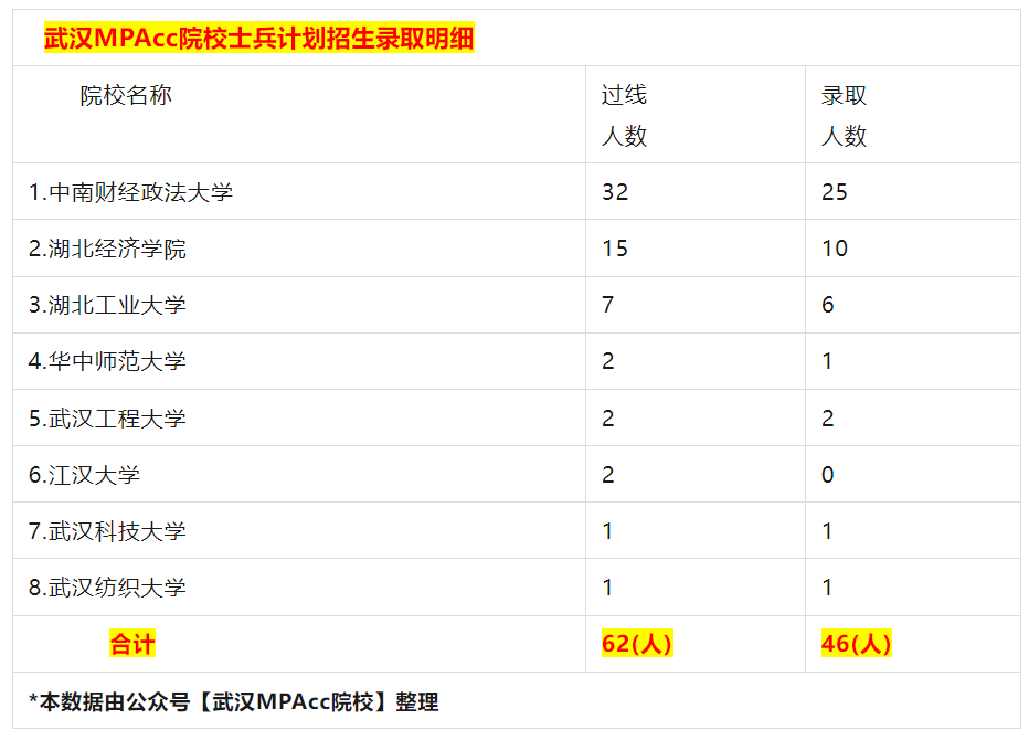 总结来说,武汉地区2023年一共有8所MPAcc院校有“士兵计划”专项名额,合计过线62人,实际拟录取46人。