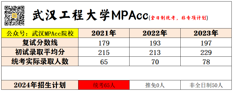 1)武汉工程大学MPAcc采用统一划线,近几年的复试分数线都是国家线,进复试的门槛是比较低的,但是复试淘汰率会比较高,最近三年里最友好的是2个淘汰1个(2022),最残酷的是4个淘汰3个(2023)。